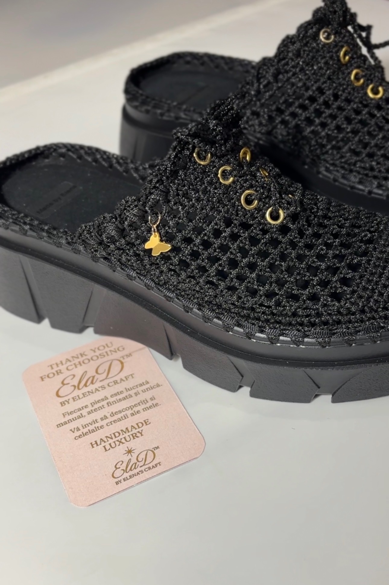 Pantofi handmade croșetați negri ElaD™ – model elegant premium cu talpă groasă