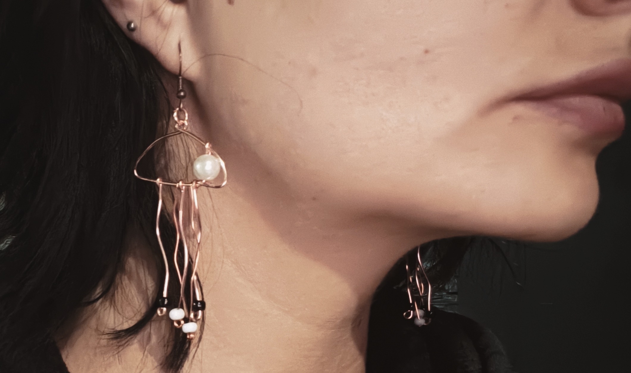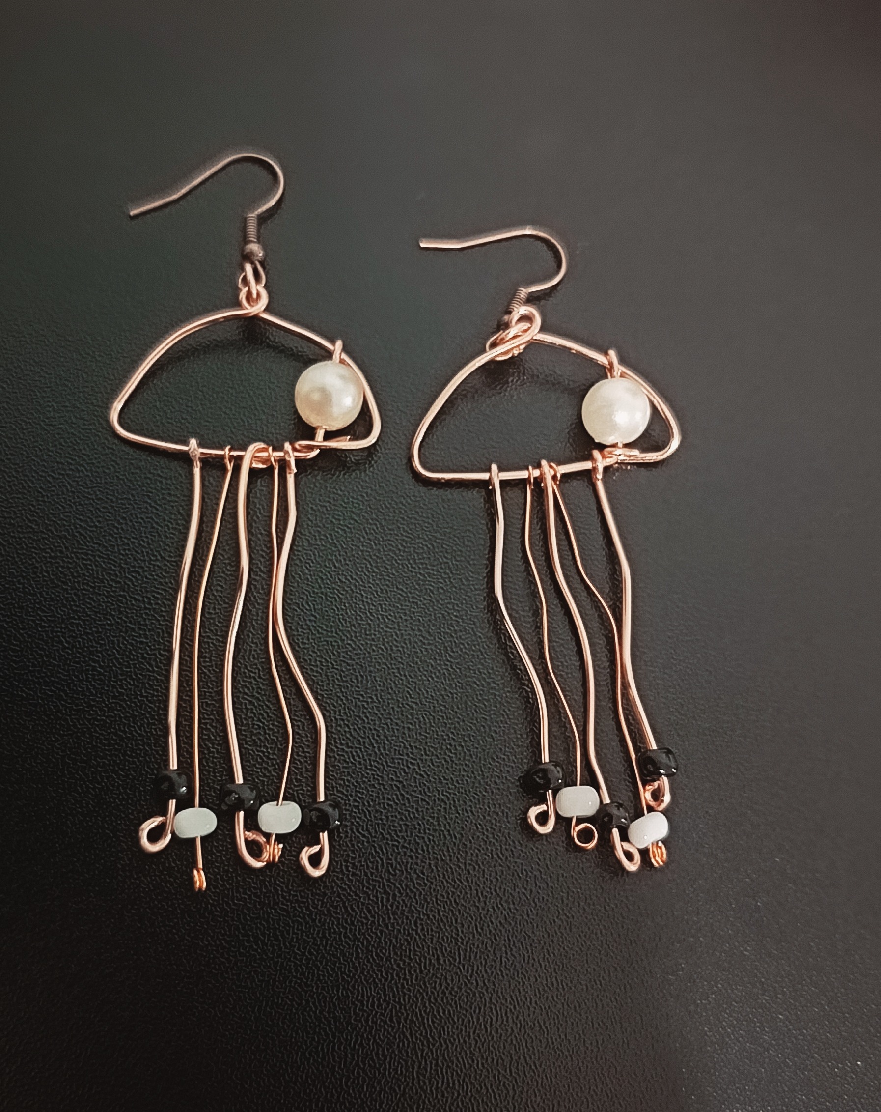 Pereche unică de cercei realizați manual, inspirați din grația meduzelor marine. Fiecare piesă este modelată din sârmă de cupru, cu o perlă centrală ce simbolizează corpul meduzei și cinci tentacule delicate decorate cu mărgele alb-negru – o interpretare artistică a mișcării fluide și misterioase a vieții subacvatice.