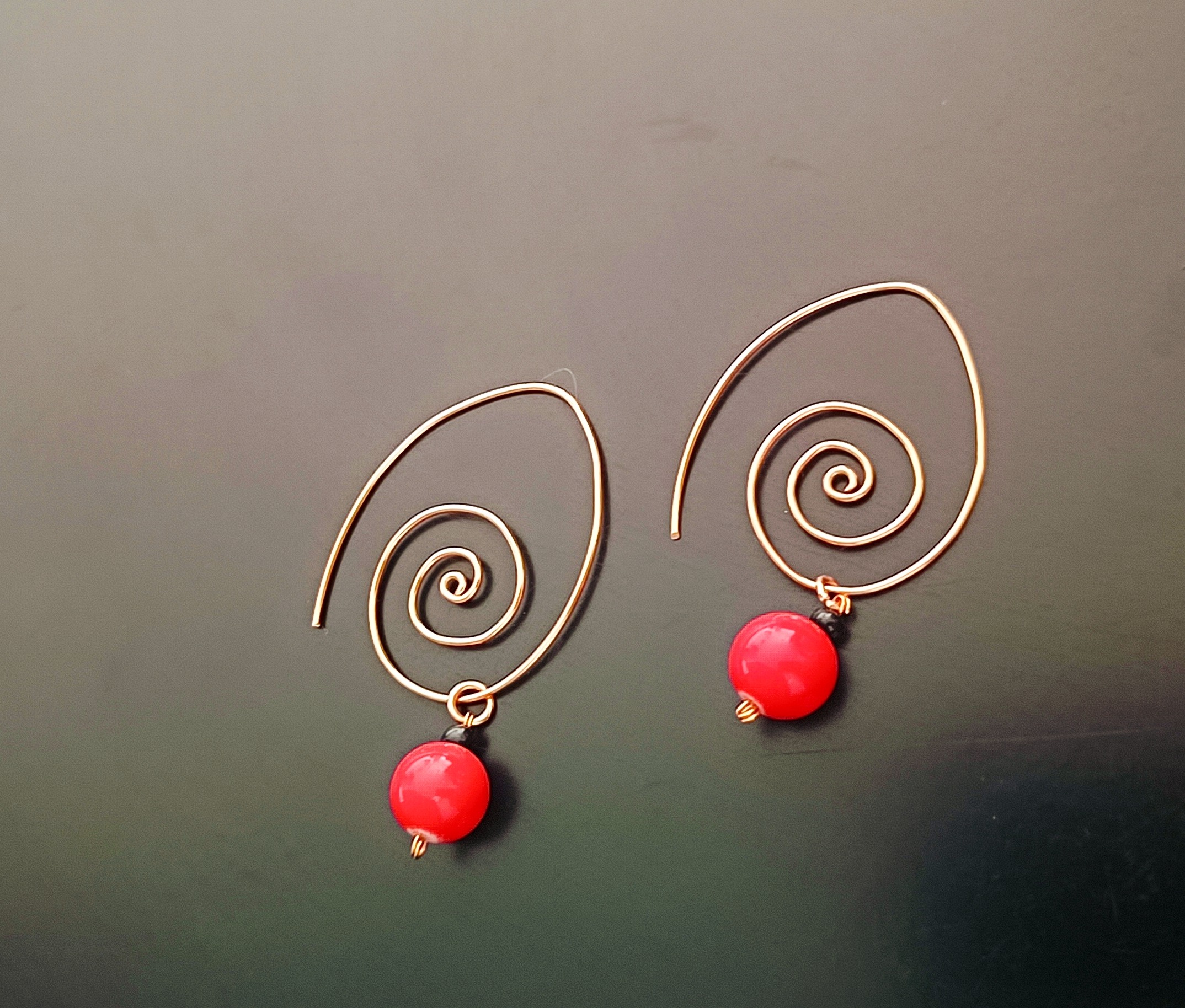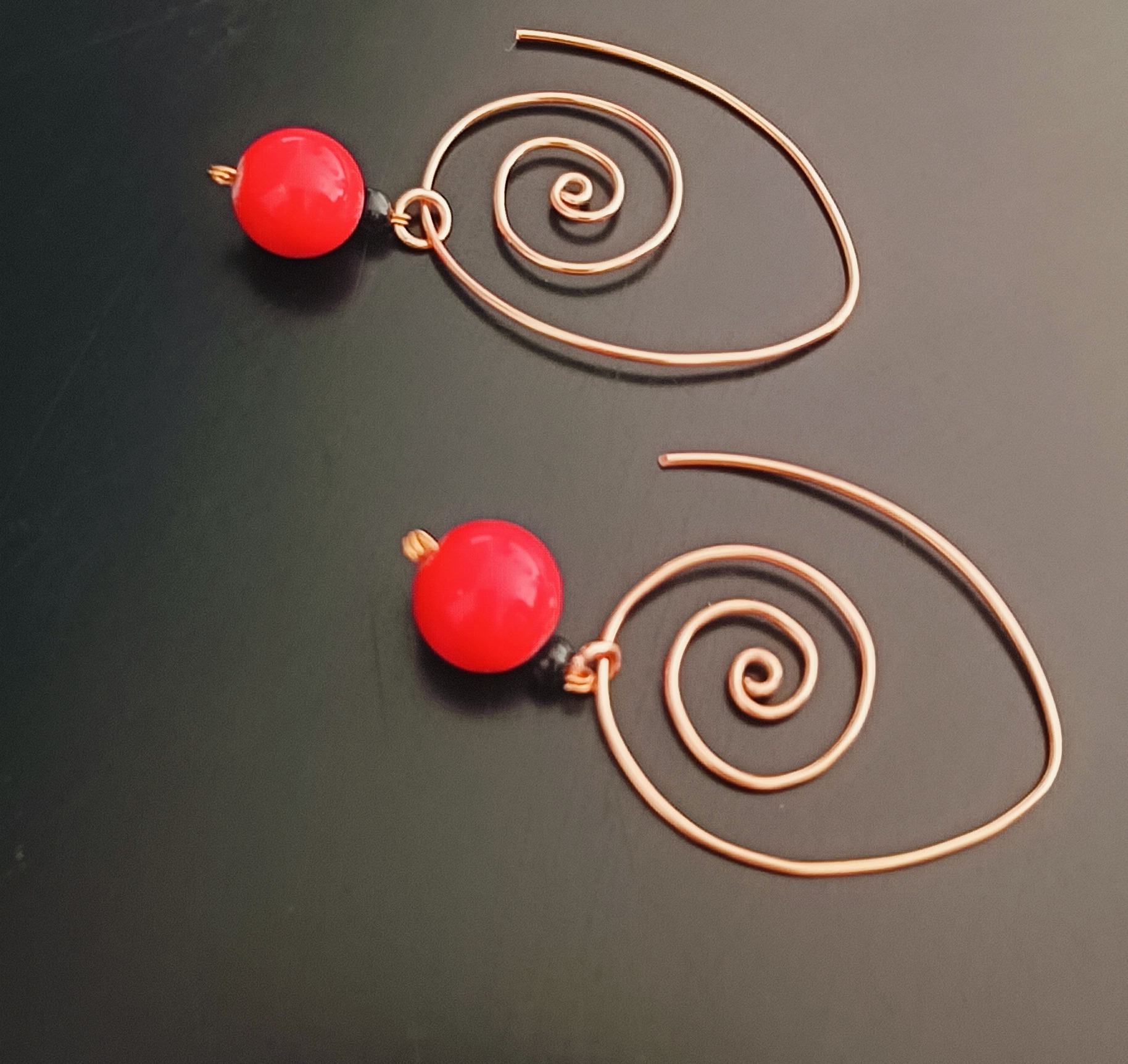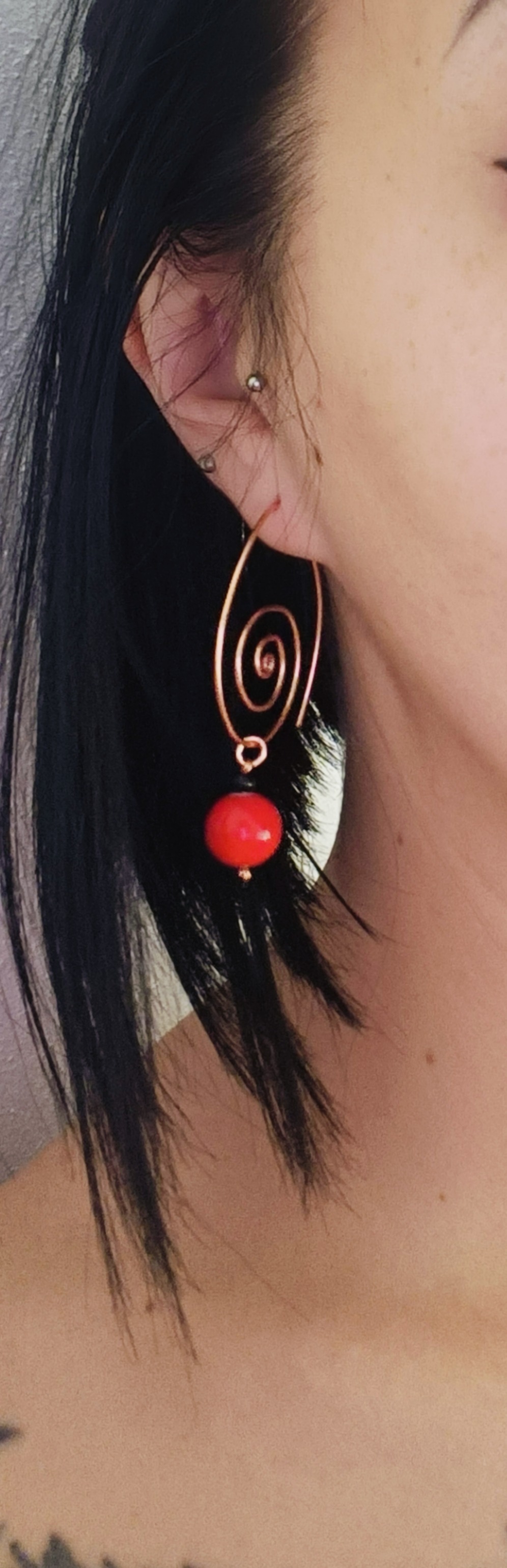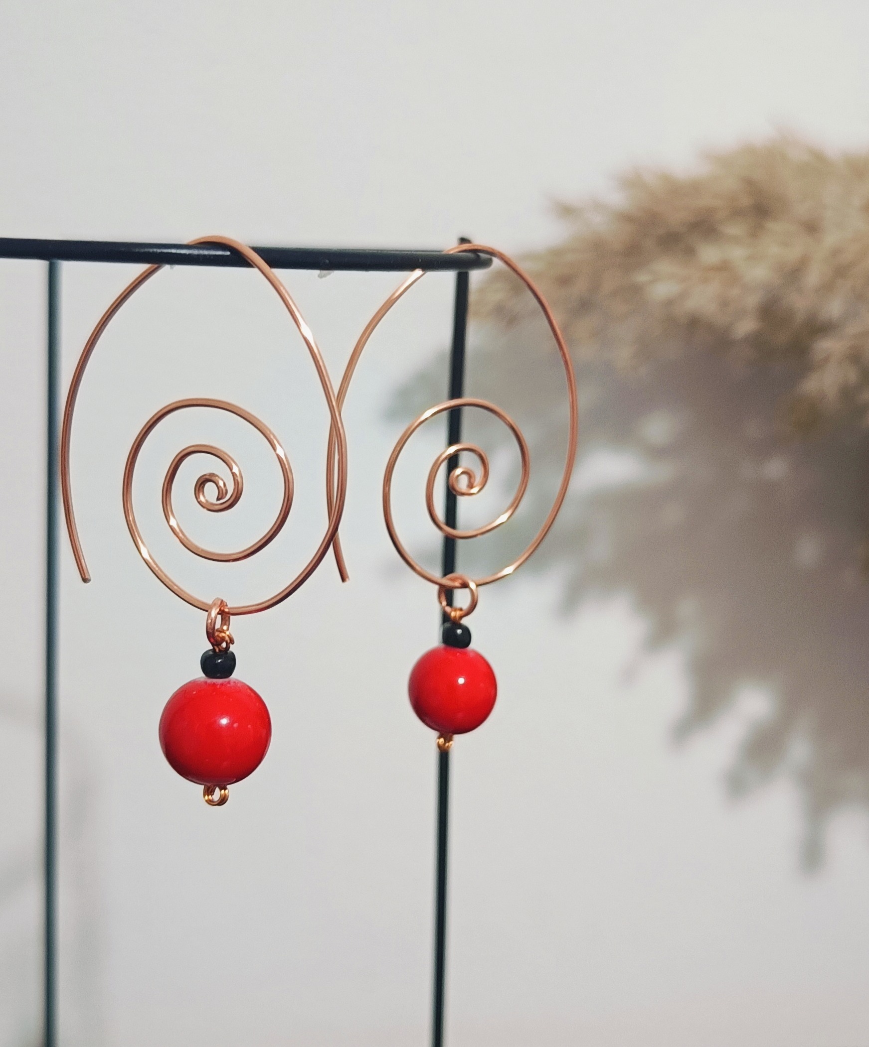 Cercei realizați manual, cu design minimalist și expresiv. Spirala din sârmă de cupru evocă mișcarea vieții și energia interioară, iar mărgelele roșii din porțelan adaugă un accent vibrant, plin de pasiune.